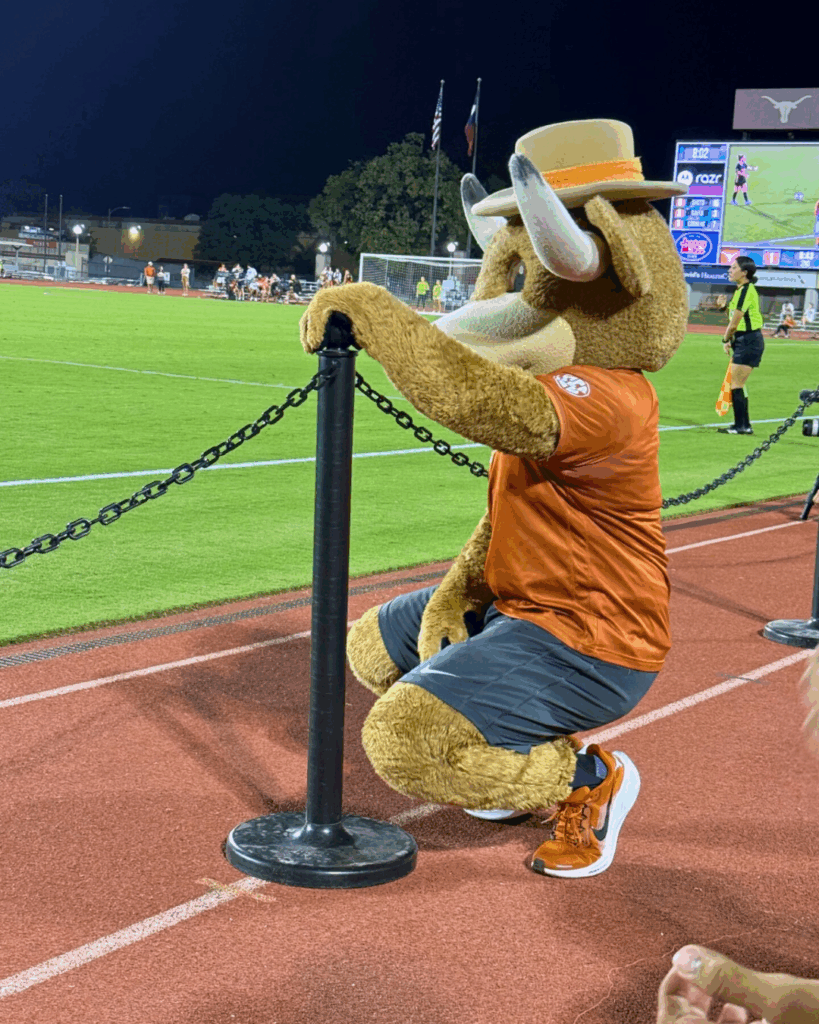 Each goal brought the crowd to its feet, and sitting directly next to the field made the group feel like they were part of the action with every pass, sprint, and shot unfolding just steps away. Even Hook ’em, the costumed mascot, looked stressed at times as he paced the sidelines and cheered on the Lady Longhorns, adding to the drama of the night.